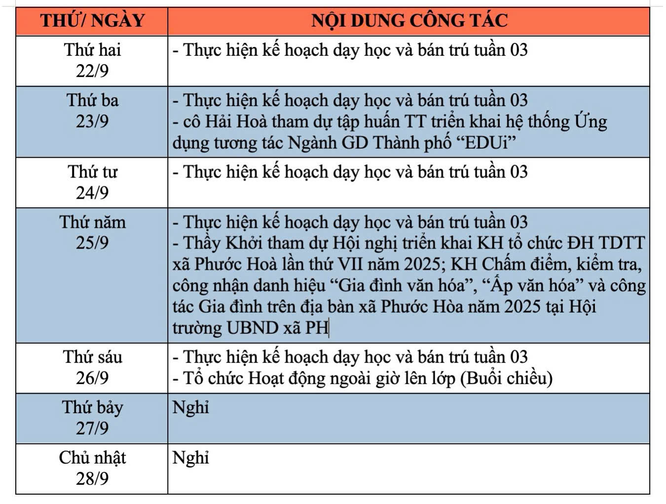 LỊCH CÔNG TÁC TUẦN 03 NĂM HỌC 2025-2026 (22/09/2025-28/09/2025)