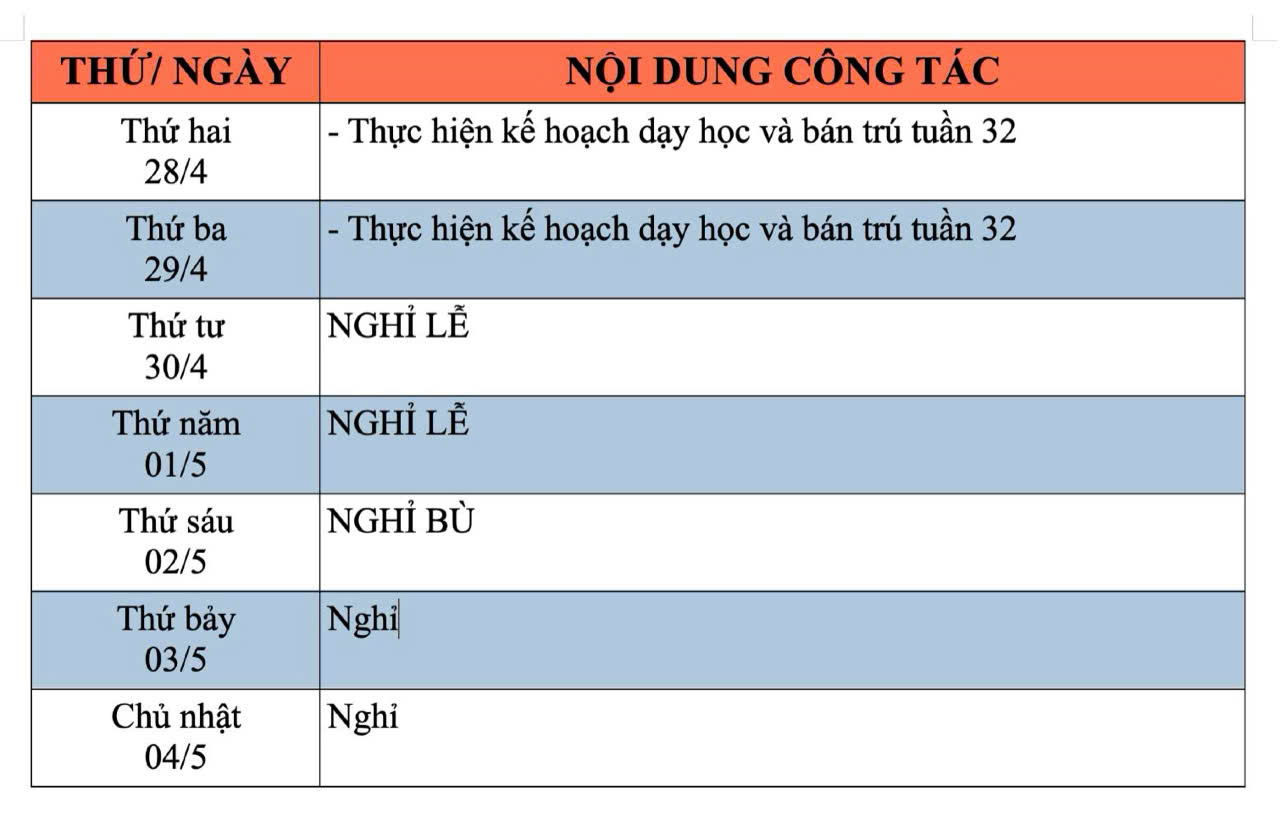 LỊCH CÔNG TÁC TUẦN 32 NĂM HỌC 2024-2025 (28/4/2025-04/5/2025)