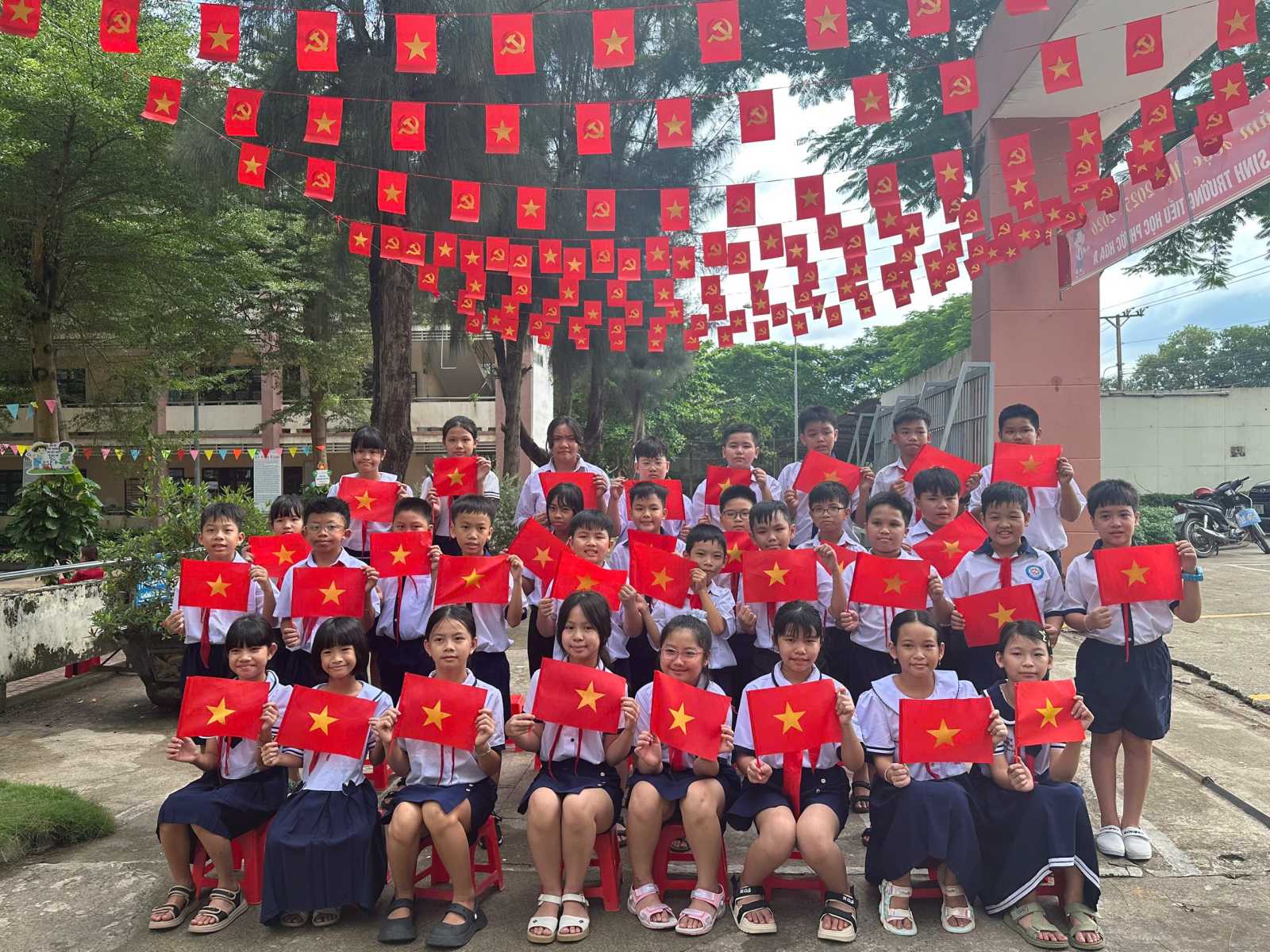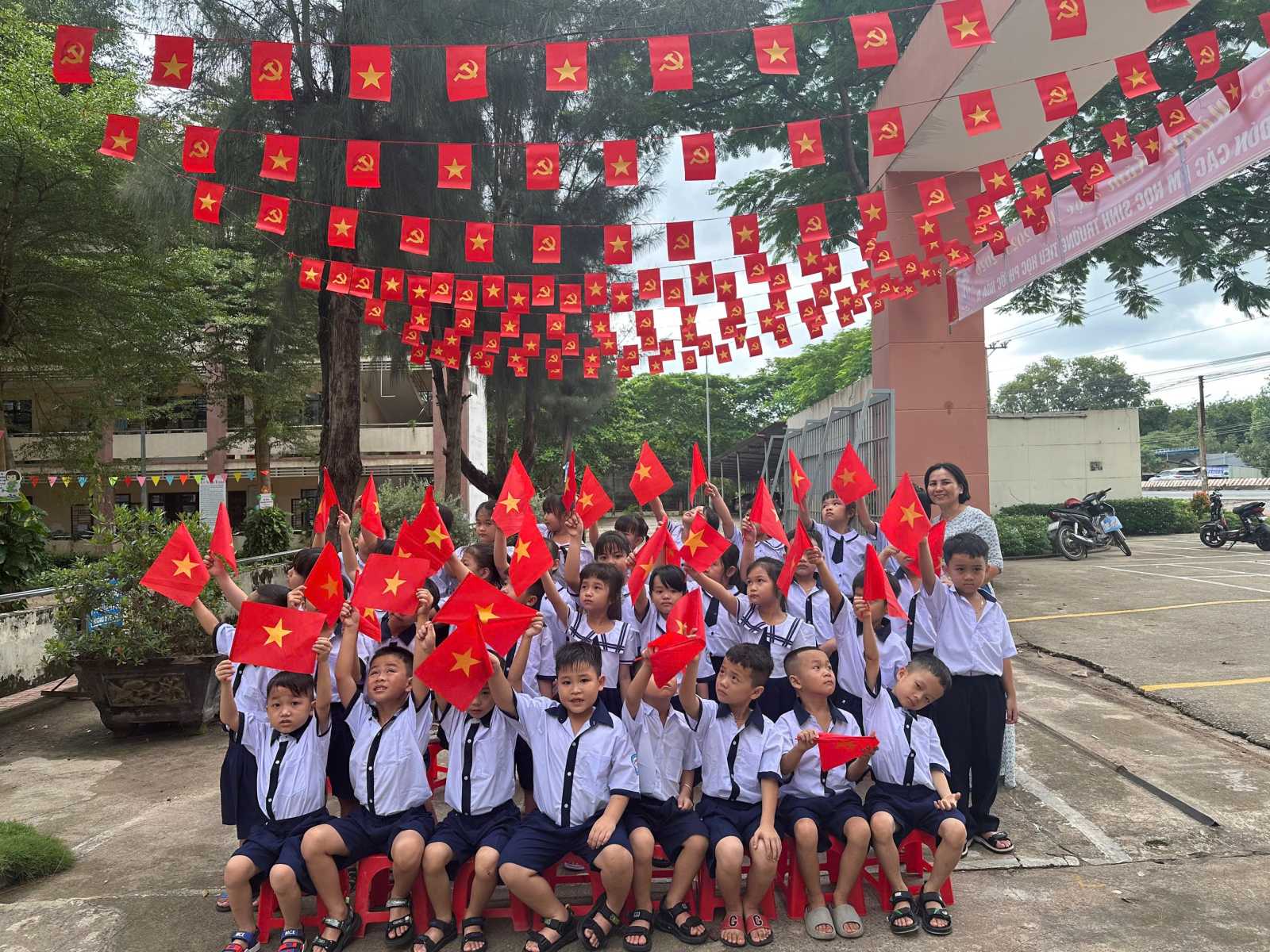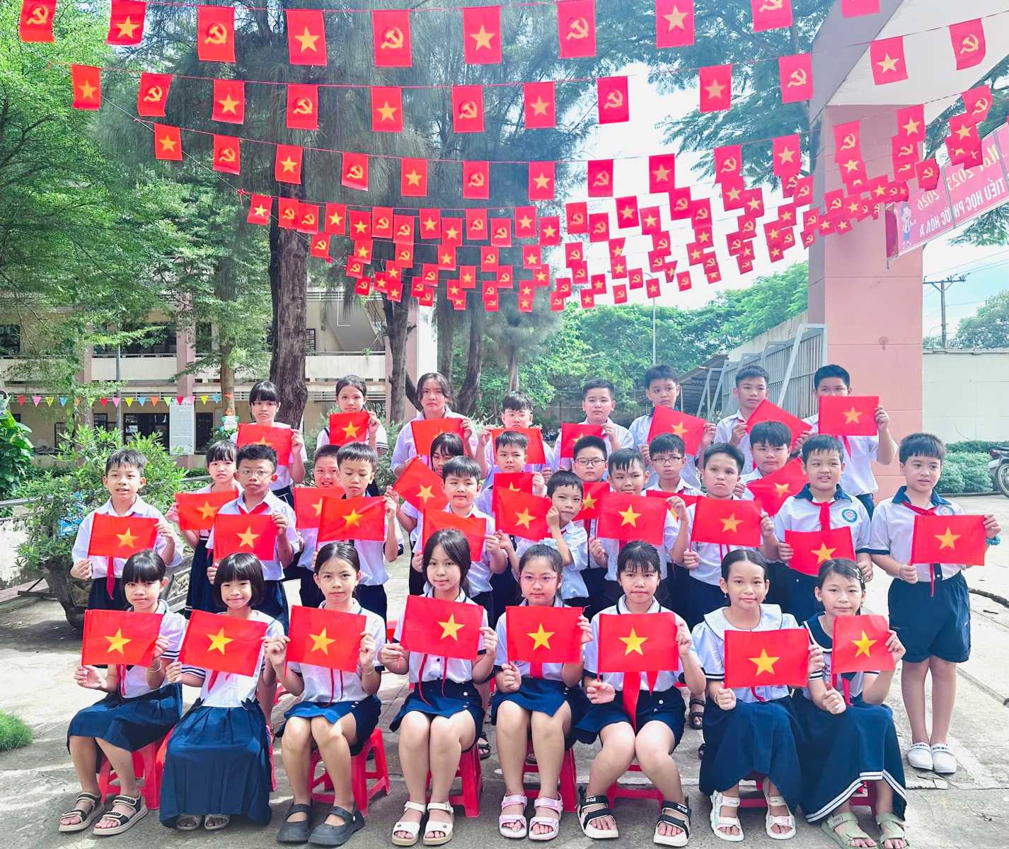 Nhà trường thực hiện treo Cờ Tổ quốc, đồng thời học sinh và giáo viên cùng nhau chụp ảnh lưu niệm bên những lá cờ đỏ thắm, tạo nên một bầu không khí rực rỡ, trang nghiêm và đầy niềm tự hào dân tộc. Hình ảnh các em học sinh hồn nhiên, rạng rỡ bên sắc cờ cùng sự hưởng ứng của thầy cô đã khắc họa một bầu trời đỏ thắm chan chứa tình yêu quê hương và niềm tự hào về độc lập – tự do.