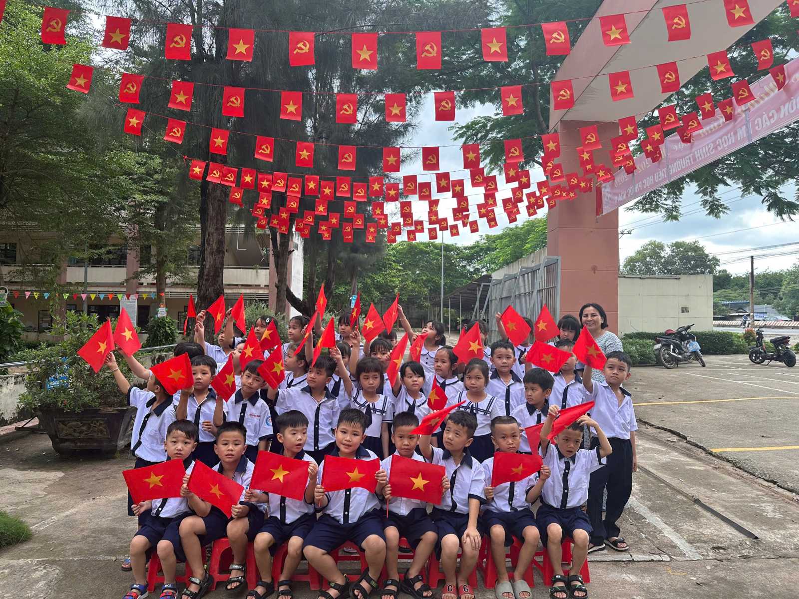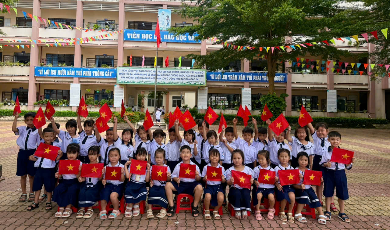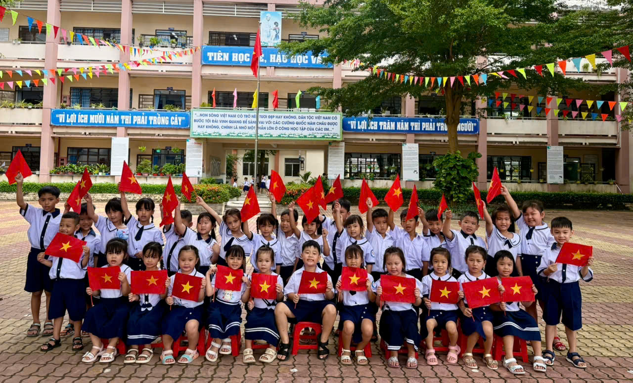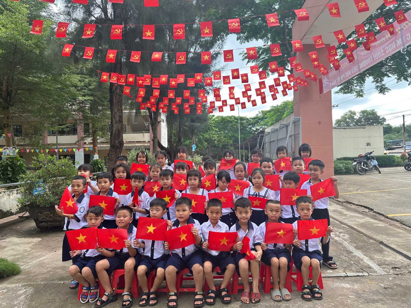 Nhà trường thực hiện treo Cờ Tổ quốc, đồng thời học sinh và giáo viên cùng nhau chụp ảnh lưu niệm bên những lá cờ đỏ thắm, tạo nên một bầu không khí rực rỡ, trang nghiêm và đầy niềm tự hào dân tộc. Hình ảnh các em học sinh hồn nhiên, rạng rỡ bên sắc cờ cùng sự hưởng ứng của thầy cô đã khắc họa một bầu trời đỏ thắm chan chứa tình yêu quê hương và niềm tự hào về độc lập – tự do.